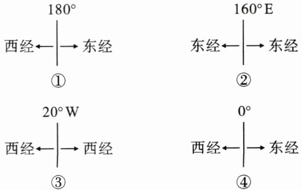 C. 跟③地所在的 20°W 经线能够组成一个经线圈的经线度数是 160°W