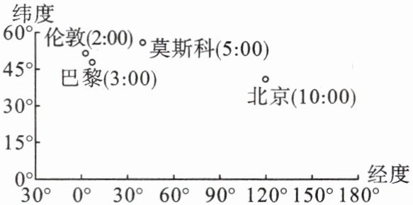 中国共产党第二十次全国代表大会于 2022 年 10 月 16 日在北京召开。下图显示伦敦、巴黎、莫斯科等地华人华侨观看大会直播的当地时间。读图,完成 4-6 题。