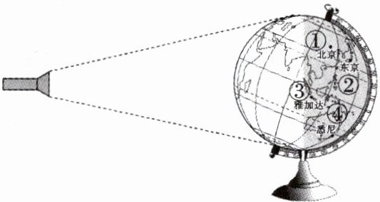 【地理实验】观察实验:用打开的手电筒模拟太阳,将地球仪放置在手电筒前方,拨动地球仪,演示地球自转。读图,完成 2-3 题。