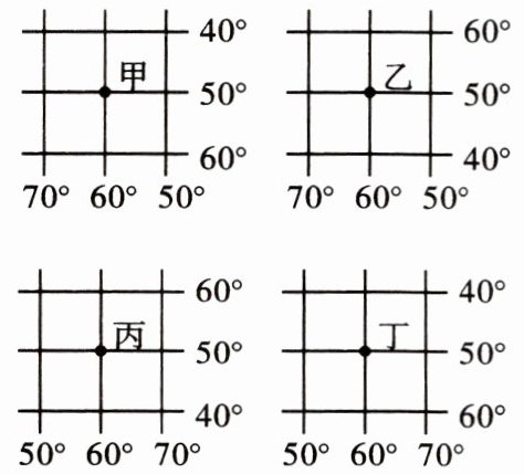 (湖北三市一企中考)读甲、乙、丙、丁四点经纬网图,完成 3-4 题。
