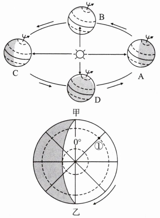 (1)2022 年 12 月 18 日第 22 届世界杯闭幕式在卡塔尔举行,此时地球公转的位置最接近甲图中