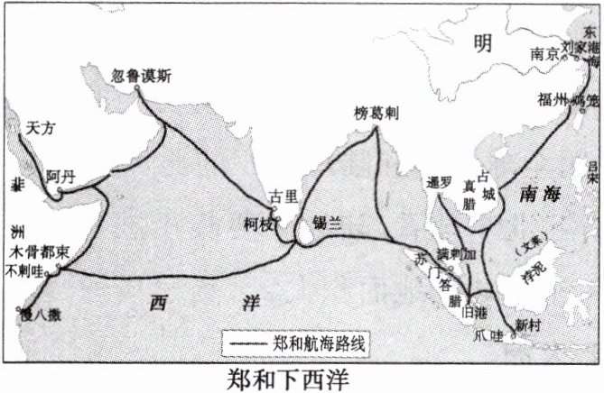 【跨历史·郑和七下西洋】(眉山市期中)1405年开始,明朝航海家郑和从南京出发七下西洋,最远到达非洲东海岸和红海沿岸。读“郑和下西洋路线图”,完成8 - 9题。