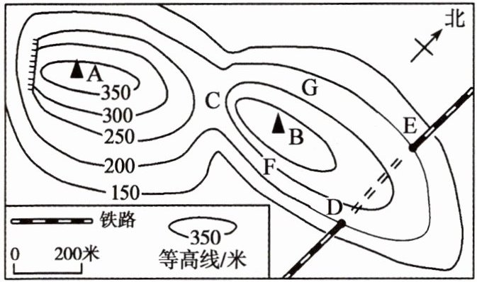 走向。图中DE为铁路穿过山体时所挖掘的隧道,隧道口D点与E点的相对高度是0