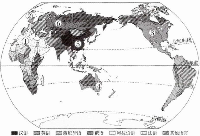 6. 读“世界主要语言分布图”,下列各地与其语言组合正确的是(