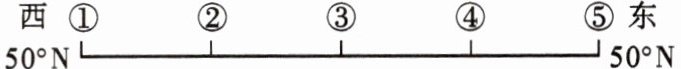 7. 下面是“亚欧大陆自大西洋沿岸到太平洋沿岸(50°N)一线示意图”,①②③④⑤分别表示5个地点。有关这5个地点降水量变化规律的说法正确的是(