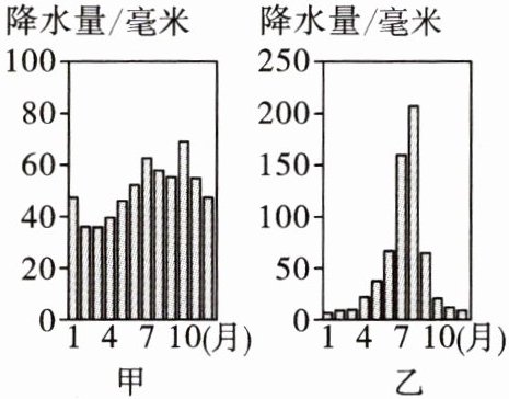 8. 关于下面甲、乙两地降水量柱状图的说法,错误的是(