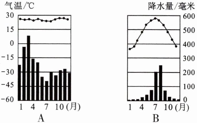 读A、B两地气温曲线和降水量柱状图,完成9-10题。