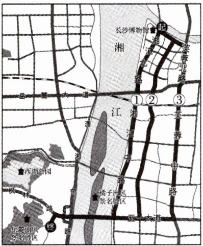 16. 【地理实践力】长沙某中学利用暑假组织学生进行研学旅行,在参观完长沙博物馆后,准备包车前往岳麓山,手机上的地图App显示有下图中的三条路线。据此,完成下列各题。