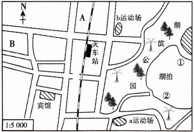 (填图中的字母代号)运动场。(3)此时湖中有人在划船,船从①处划向②处时是