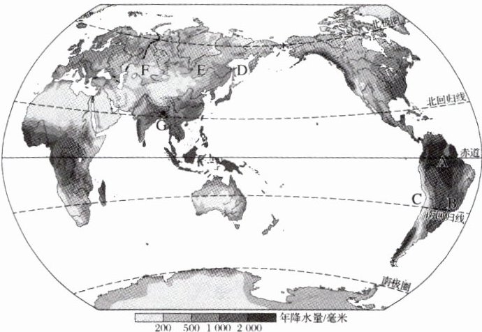 岸降水少。(3)D、E、F是几乎位于中纬度地区的同一纬线上的三点,从D到E,再到F,离海洋越来越