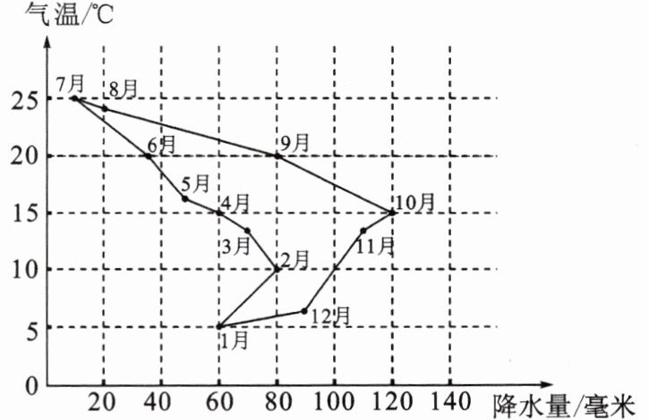 气候数据有多种呈现方式,下图是把代表月份的数字标注在以气温和降水量为坐标的图上,一个月份的点在图中的坐标就是该月的平均气温和降水量。读图,完成11-12题。