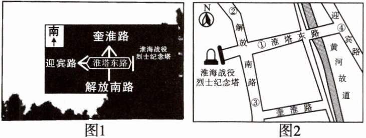 【新考法·红色革命文化】(徐州市中考)徐州某中学学生步行前往淮海战役烈士纪念塔参加清明祭扫活动。图1为“该学生途中迎面看到的道路指示牌”,图2为“淮海战役烈士纪念塔位置示意图”。据此完成1-2题。