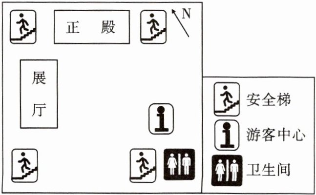 4. 杭杭到达游客中心,准备去地下一层参观,图中离他直线距离最近的安全梯位于他的(