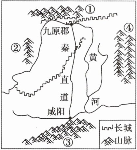 新素材 秦直道 秦直道南起咸阳,北抵九原郡,是与长城、兵马俑相媲美的世界奇迹,它始建于公元前212年,是我国最早的一条“高速公路”。下图为“秦直道示意图”,据此完成1-2题。