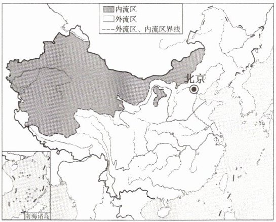 如图为“我国内、外流区分布示意图”,据此完成1-3题。
