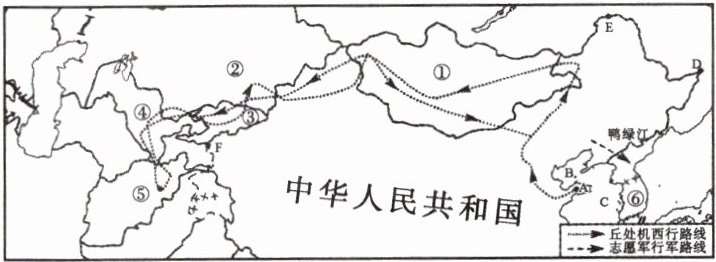 (2)从图中看出,丘处机西行途经的国家①②③④⑤中,②是