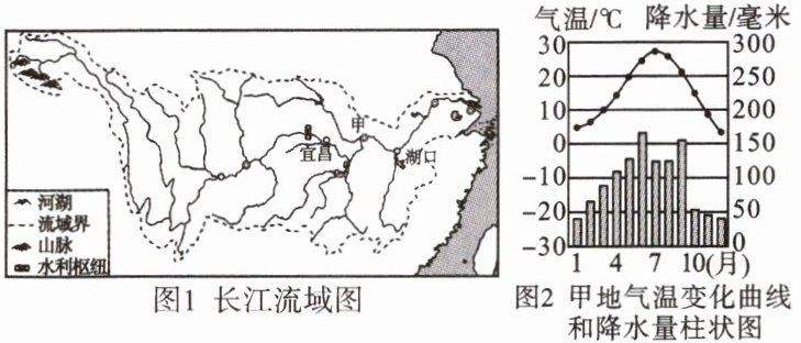 (1) 结合图2,分析长江的水文特征。(从流量、汛期、结冰期等方面说明)