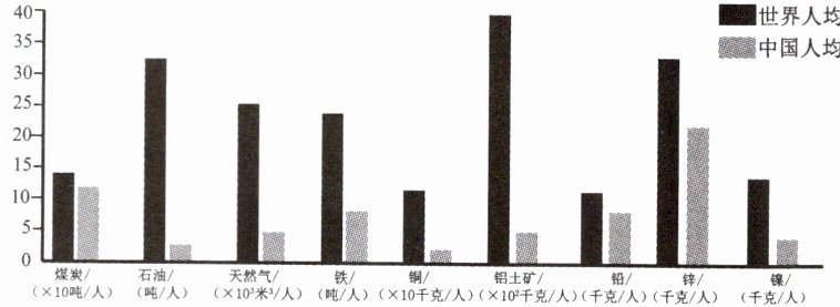 3. 下图为“某年世界和中国主要矿产资源人均储量对比图”。图中直接反映出我国矿产资源(