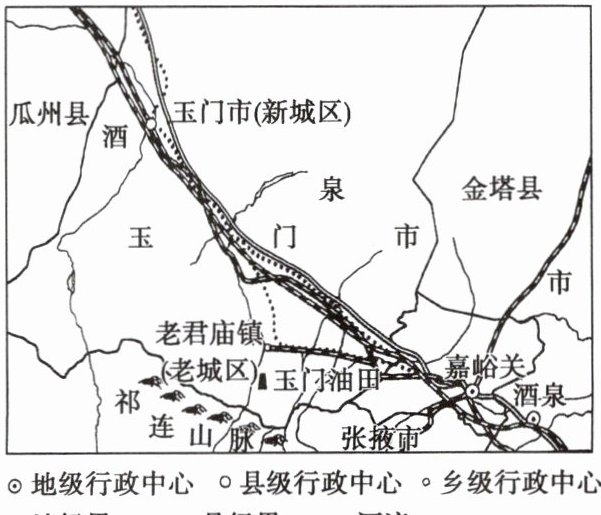 甘肃省玉门市是中华人民共和国成立以来一座著名的“因矿设企,因企设市”的老工业城市,1957 年,玉门建成中华人民共和国成立以来第一个石油工业基地玉门油田,当年原油产量就接近 76 万吨,占全国总产量的 87%以上,它的老城区坐落在河西走廊西端、祁连山北麓,曾经因为石油产业而十分兴盛。下图为“玉门位置示意图”。