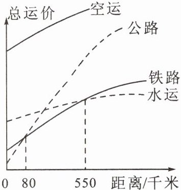 材料二 四种运输方式运费与运输距离相关曲线。