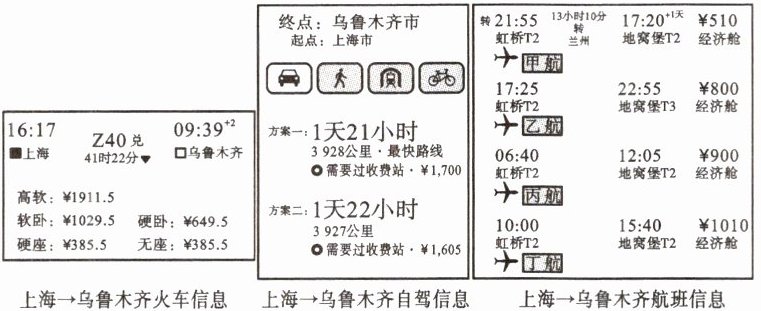 家住上海市区的小王一家四口计划暑假去新疆旅游。下图示意小王查询到的上海到乌鲁木齐不同交通运输方式的信息。读图,完成12-13题。