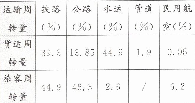 材料一 我国各种运输方式的运输周转量构成表。