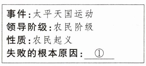 (3)根本原因:“洋人助妖”。(1分)是否认同:不认同。(1分)理由:太平天国运动失败的根本原因是农民的阶级局限性,中外反动势力联合镇压只是太平天国运动失败的客观原因。(2分)