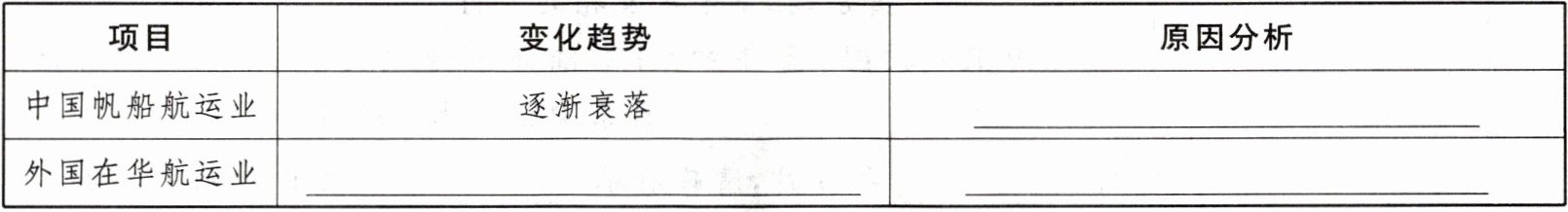 (1) 根据材料一并结合所学知识,完成下列有关19世纪50—70年代中国航运业的表格。(3分)