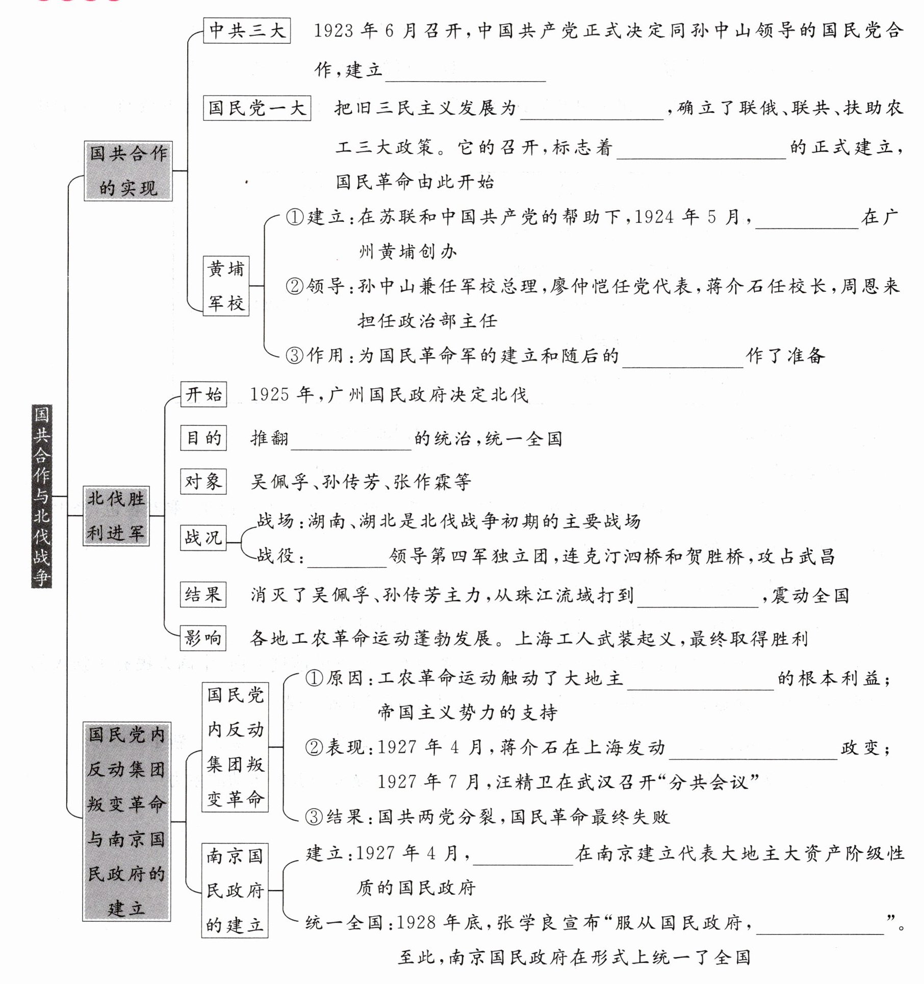 革命统一战线 新三民主义 国共两党合作 孙中山 北伐战争 北洋军阀 叶挺 长江流域 大资产阶级 四一二反革命 蒋介石 改易旗帜