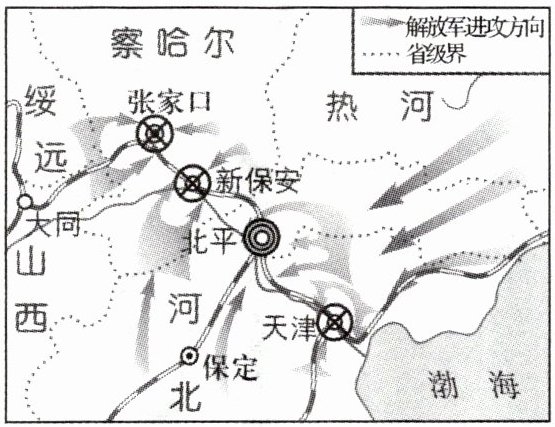 6. 时空观念 如图是人民解放战争中的一场重要战役,这场战役的胜利使华北全境基本解放。根据图中信息指出,这场战役是(