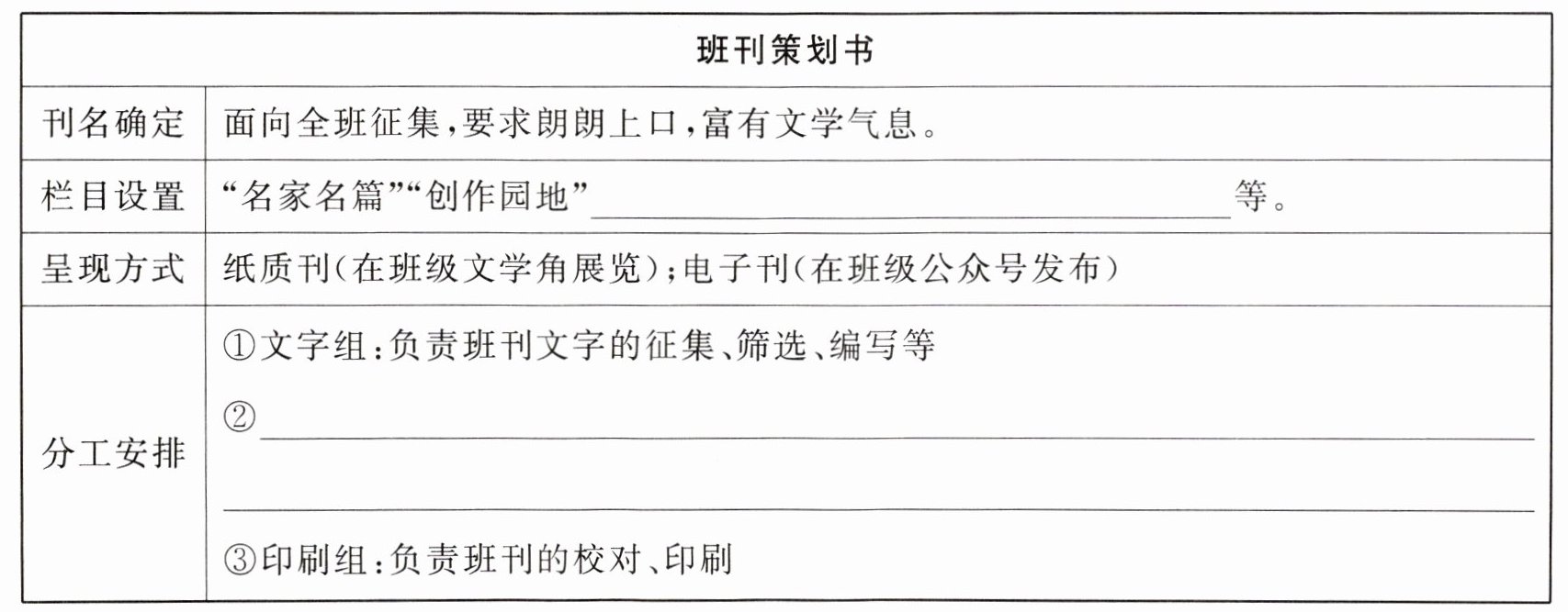 5. 班刊编辑部正在积极筹划第一期作品,请你出谋划策,将“策划书”补充完整。