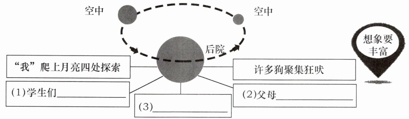5.月亮“停留在我们的后院”,小镇发生了哪些不寻常的事?阅读绘本,补全思维导图。