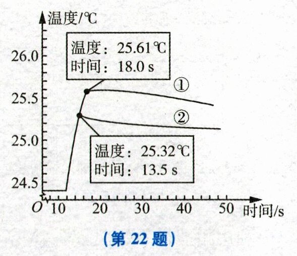 22. (4 分)某科学兴趣小组的同学为了探究化学反应中的能量变化,进行盐酸与碳酸氢钠溶液的反应实验。如图所示为某同学在 20℃、基本隔热条件下,利用温度传感器分别测定向 20mL 水和 20mL 饱和碳酸氢钠溶液中各倒入 20mL 浓度为 13.7%的盐酸时温度随时间变化的曲线,曲线①为“水 + 13.7%的盐酸”的温度变化曲线,曲线②为“饱和碳酸氢钠溶液 + 13.7%的盐酸”的温度变化曲线。实验测得饱和碳酸氢钠溶液稀释时温度变化不大,可忽略不计。