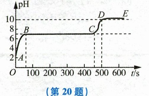 20. (3 分)向盐酸和氯化钙的混合溶液中逐滴滴入碳酸钠溶液,并用 pH 传感器连续监测,得到 pH 随时间变化的曲线如图所示。
