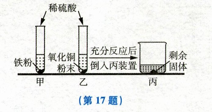 17. 将铁粉与氧化铜粉末分别放入甲、乙两试管中,并按如图所示进行实验,稀硫酸的质量分数为 10%。下列说法中,不正确的有(