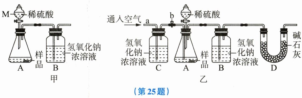 25. 为测量纯碱样品中碳酸钠的质量分数,小金设计了如图甲所示的实验,已知装置气密性良好,样品完全反应,通过称量装置B的质量变化来确定样品中碳酸钠的质量分数(其他杂质不与酸反应)。