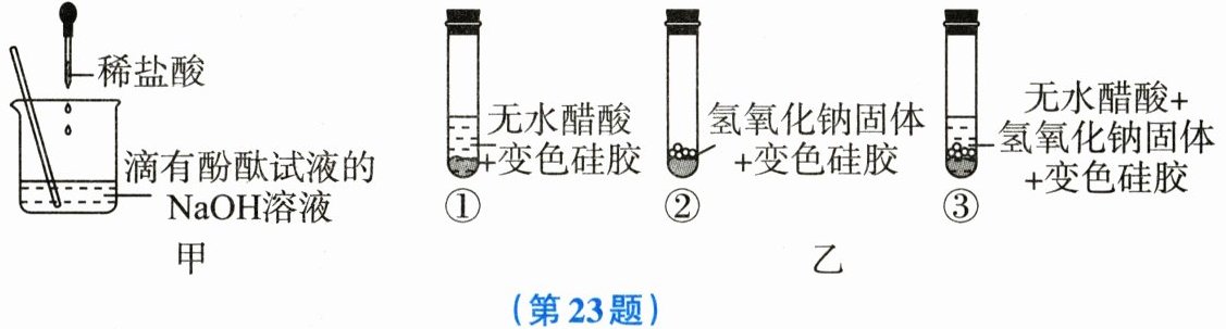 小杨取变色硅胶(吸水后由蓝色变为红色)、无水醋酸(一种酸,常温下为无色液体)和氢氧化钠固体进行如图乙所示的三个实验。