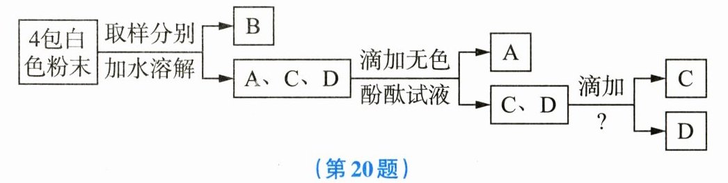 20. 现有4包白色粉末,编号为A、B、C、D,它们分别是硫酸铜、氯化钠、硝酸钾、氢氧化钠中的某一种,现通过下列实验对其一一进行鉴别。