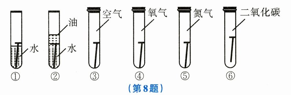 8. 已知铁锈的主要成分为${Fe_{2}O_{3}}\cdot x{H_{2}O}$,如图所示为某同学探究铁生锈所设计的实验方案,其中不需要做的实验是 (