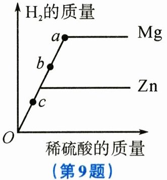 9. 甲、乙两个烧杯中分别装有等质量的金属锌和镁,然后分别逐渐加入同浓度的稀硫酸,产生氢气的质量与加入稀硫酸的质量关系如图所示。下列说法中,不正确的是 (