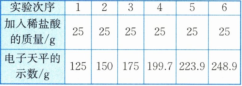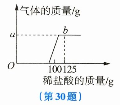 30. (8分) 实验室有一包变质的氢氧化钠样品(样品中只含碳酸钠杂质,且成分均匀)。为测定样品中$Na_{2}CO_{3}$的质量分数,小科称取10g氢氧化钠样品放入烧杯中,加入40g水使其完全溶解,将150g稀盐酸平均分成6份,依次加入烧杯中(烧杯的质量为50g),每次充分反应后都用电子天平进行称量(假设产生的气体全部逸出),实验数据如表所示,如图所示为产生气体的质量与加入稀盐酸质量的关系。
