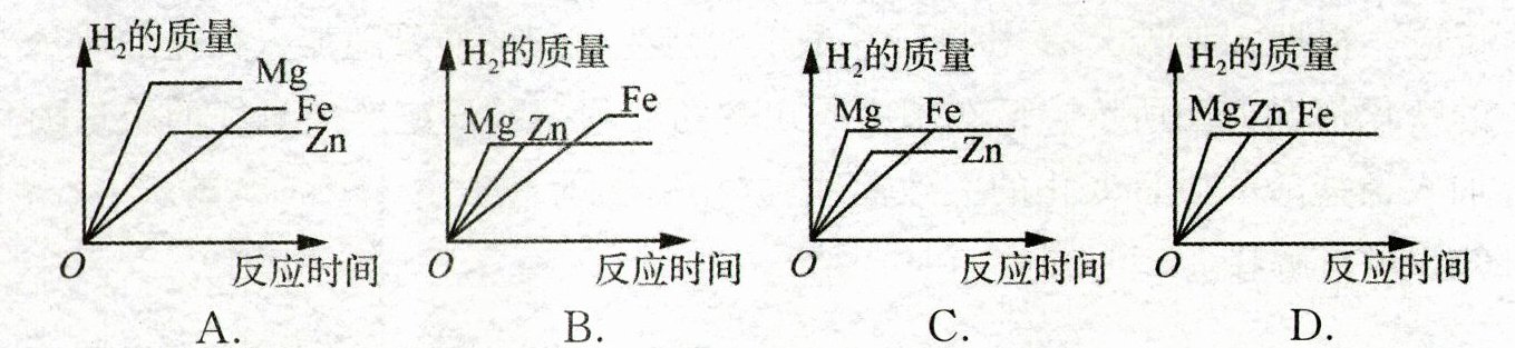 8. 将质量均为10g的Mg、Fe、Zn三种金属分别放入质量和溶质质量分数均相同的三份稀盐酸中,反应完成后,生成氢气的质量关系不可能的是(