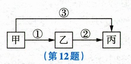 12. 甲、乙、丙是初中科学常见的物质,且类别(单质、氧化物、酸、碱、盐)相同,它们的转化关系如图所示,“→”表示一种物质经一步反应转化成另一种物质,部分反应物、生成物及反应条件未标出。下列说法中,与图示关系不符的是(