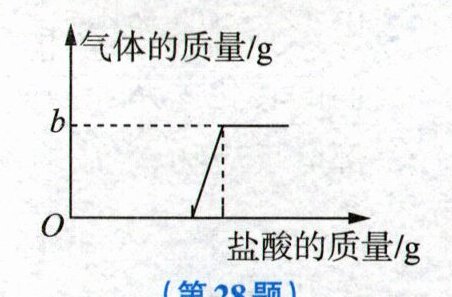 28. (8分)小宁在化学实验室发现了一瓶敞口放置的$Ca(OH)_2$粉末状试剂。他对该试剂进行了定量实验分析:称取19.8g试剂放入锥形瓶中,加入30.2g水,充分振荡,再向锥形瓶中依次滴加25g盐酸,充分反应后,测得部分数据如表所示,并绘制了相关图像。