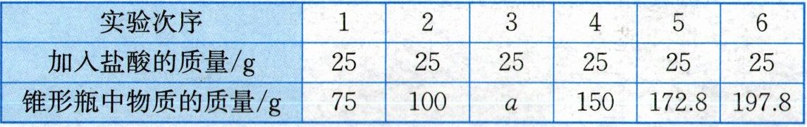 (1)由表中的数据可知,第1、2、4次加入盐酸的质量就等于锥形瓶中增加的质量,所以第3次加入盐酸后物质的质量就是前2次锥形瓶中物质的质量再加上盐酸的质量,故a的值为100+25=125。