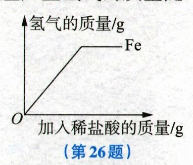 26. (5分)取等质量的铁粉和锌粉,分别与足量溶质质量分数相同的稀盐酸充分反应。根据实验测定:铁粉与稀盐酸反应产生氢气的质量随加入稀盐酸质量的变化情况如图所示。请在图中画出锌粉与稀盐酸反应产生氢气的质量随加入稀盐酸的质量变化的大致曲线,并用所学的科学知识进行解释。
