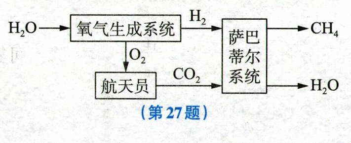 27. (5分)如图所示为某国际空间站的水气整合系统,其中“氧气生成系统”能电解水,产生氢气和氧气;“萨巴蒂尔系统”能在一定条件下使氢气和航天员呼吸产生的二氧化碳反应生成液态水和甲烷气体;液态水可即时循环利用,甲烷被排放到外太空。