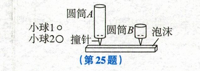 25. 现有两个质量不同的实心小球、两个高度不同的圆筒、撞针、泡沫、刻度尺,如图所示。请利用上述实验器材设计一个实验来证明:物体的重力势能与物体所处位置的高度有关。