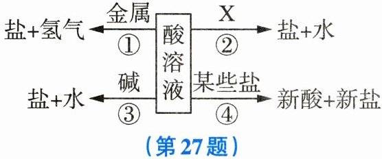 27. (6分)学习科学的重要方法之一是对知识点的归纳和总结,学习酸的性质后,小敏总结了酸的化学性质,如图所示。请根据要求回答下列问题: