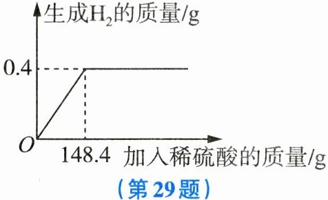29. (6分)向一定质量的含杂质的锌样品中加入稀硫酸,使其充分反应(杂质不与稀硫酸反应),所加稀硫酸与生成气体的质量关系如图所示。(提示:稀硫酸与锌反应生成硫酸锌和氢气)